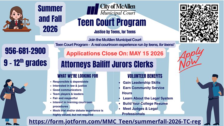 McAllen TX - The City of McAllen Teen Court program is accepting applications for student volunteers ages 14 and older who live in McAllen, attend a McAllen high school or reside in surrounding areas.