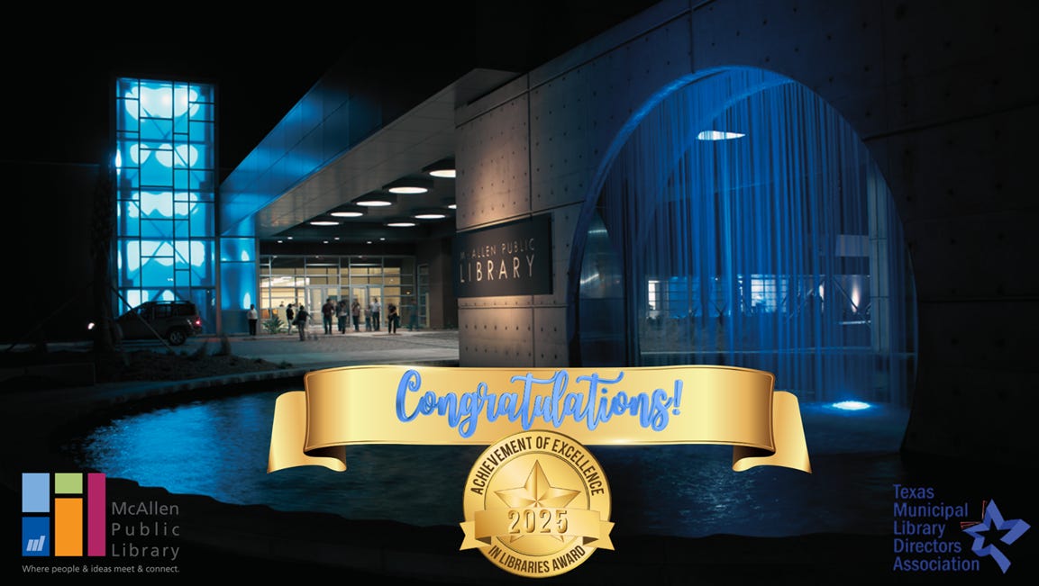 The Achievement of Excellence in Libraries Award recognizes public libraries for high levels of service, innovation and community engagement. Out of more than 500 public libraries across Texas, 101 received the designation in 2025, placing McAllen Public Library among the top 20 percent statewide.