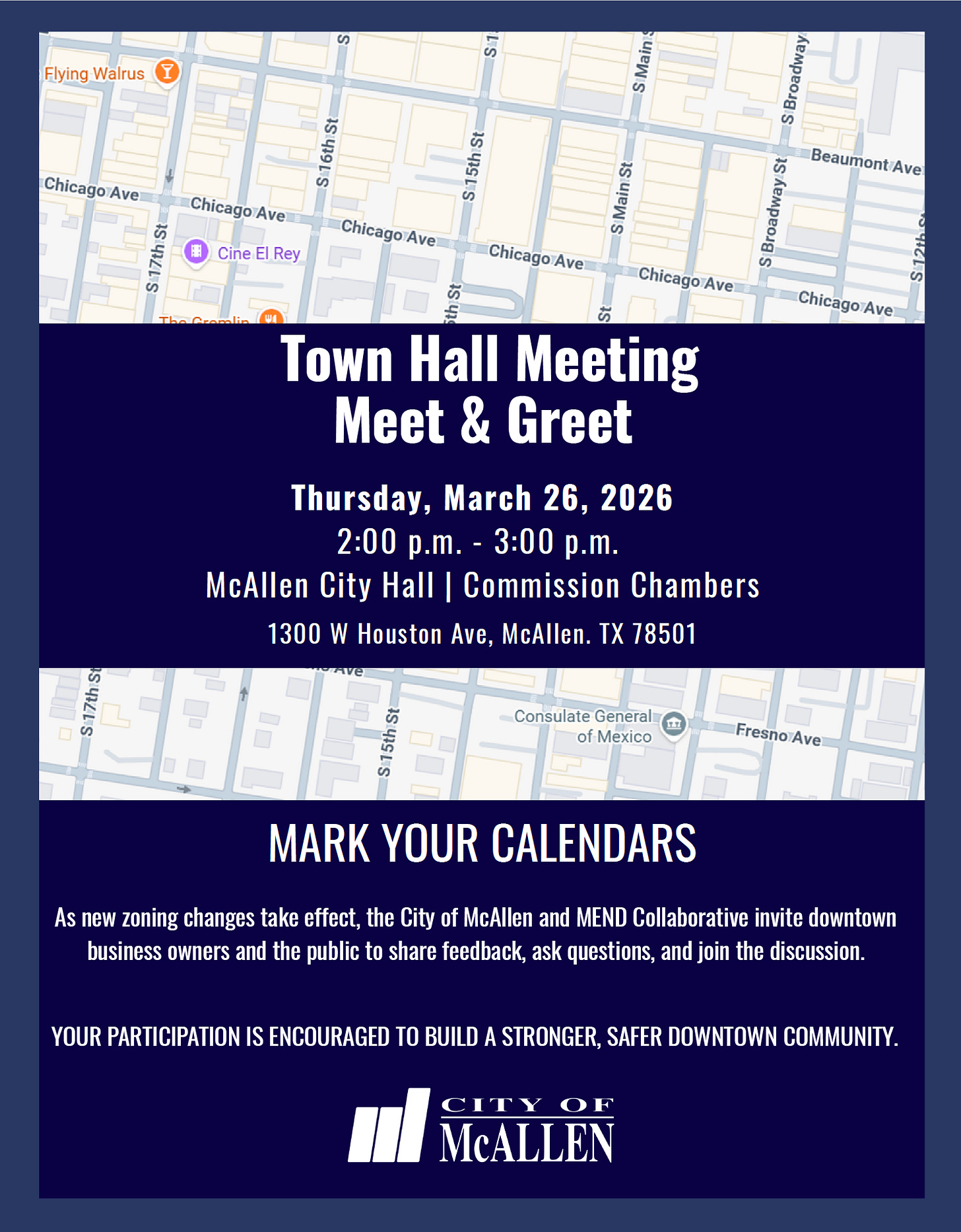 McAllen, TX - The City of McAllen, in partnership with MEND Collaborative, will host a Town Hall Meeting on March 26, 2026, to discuss updates affecting downtown development. The meeting will focus on proposed changes to the Unified Development Code and an ongoing study guiding future growth in the downtown area. The session will take place from 2 p.m. to 3 p.m. at McAllen City Hall Commission Chambers, 1300 W. Houston Ave.