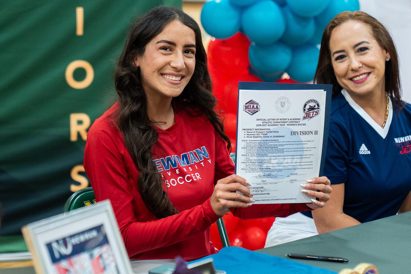 Photo above: Dariett Perez, left, holds up her letter of commitment for Newman University, an NCAA Division II school in Wichita, Kansas, while her mother, Yoana Cantu, watches. Photo courtesy MISD Communications.