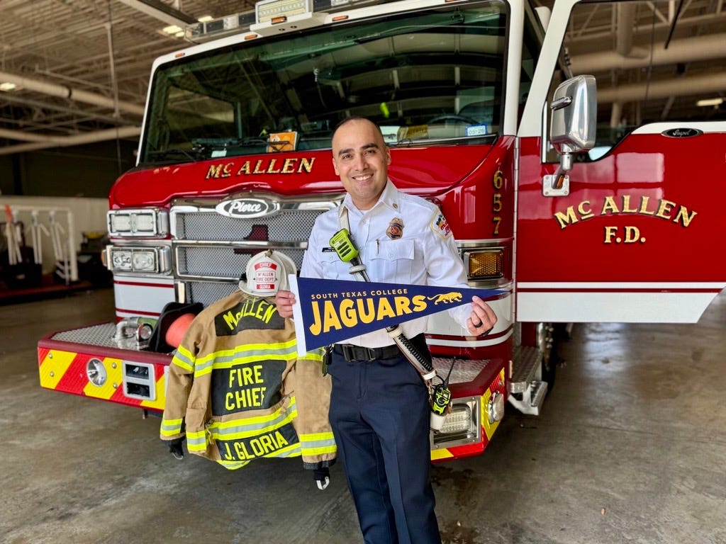 McAllen TX - Starting his career in fire at just 15 years old, McAllen Fire Chief and South Texas College alumnus Juan Gloria worked his way through the ranks after moving to the United States as a teenager and overcoming language barriers. Today, he leads more than 180 firefighters at the McAllen Fire Department.
