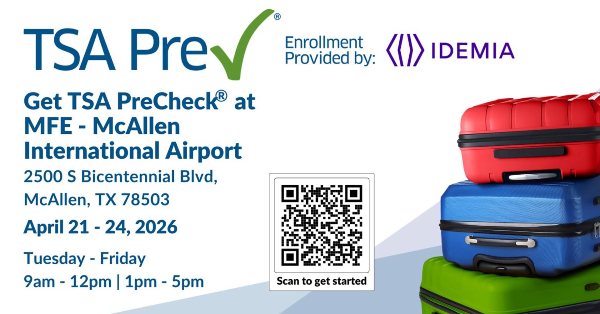 McAllen TX - McAllen International Airport is hosting a TSA PreCheck pop-up enrollment event in collaboration with IDEMIA from April 21 through April 24, 2026.