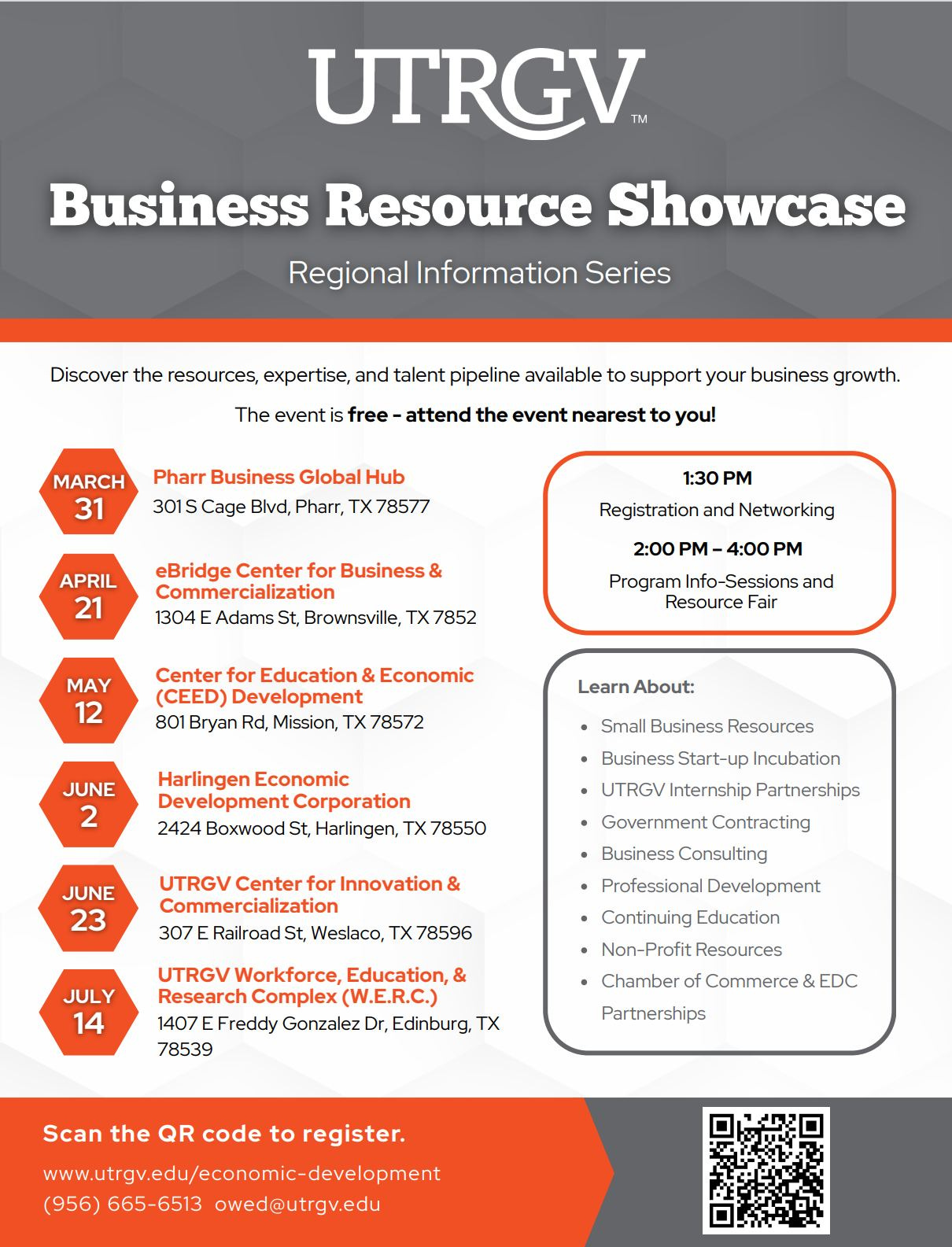 Topics scheduled for discussion include small business resources, start-up incubation programs and internship partnership opportunities. Additional subject areas include government contracting, business consulting, professional development and continuing education programs available through UTRGV and partner organizations.