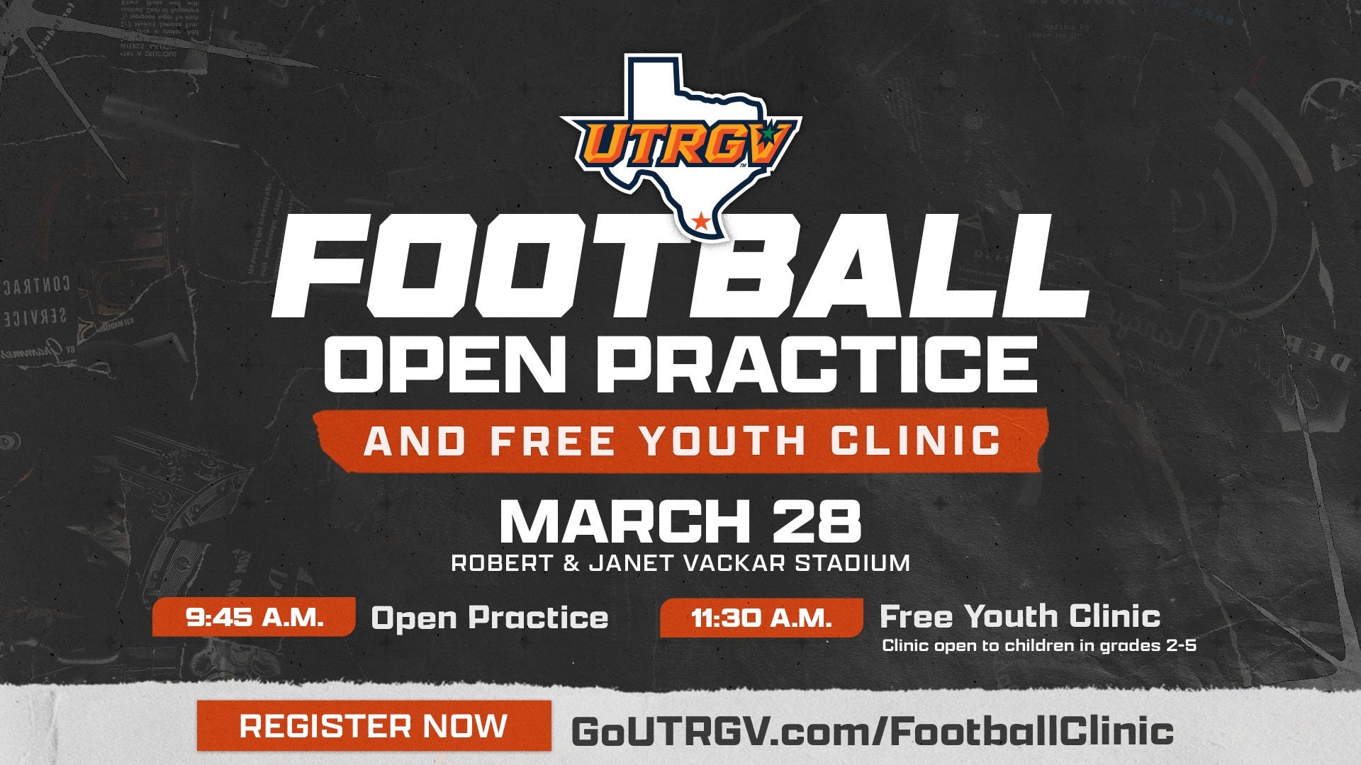 Edinburg, TX - UTRGV Football will host an open practice and free youth clinic March 28, 2026, at Robert and Janet Vackar Stadium. The open practice is scheduled to begin at 9:45 a.m., with gates opening at 8:45 a.m. A youth clinic for children in grades 2 through 5 will follow at 11:30 a.m.